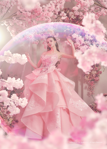 映画『ウィキッドふたりの魔女』の象徴的な「グリンダ」の衣装から着想を得た、華やかなピンクドレスです。サテンオーガンジーで仕立てた大きなラッフルフリルが立体的に重なり、特別な存在感を放ちます。身頃には上質なピンクビジューを贅沢にあしらい、可憐な印象の中に、ほどよい気品と輝きを添えました。ふんわりと広がるスカートには、シャボン玉のようにきらめくグリッターを散りばめ、動くたびに光が舞い上がるような、幻想的な表情を生み出しています。