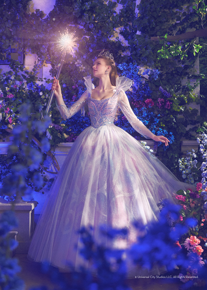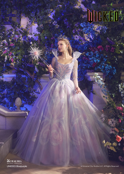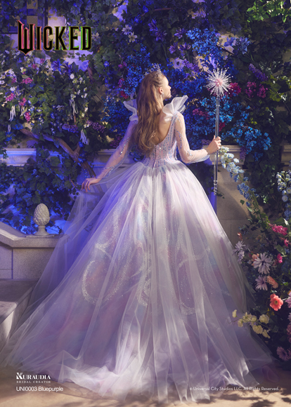 映画『ウィキッド 永遠の約束』の象徴的な「グリンダ」の衣装から着想を得た、幻想的なブルーパープルの色合いが素敵なドレス。