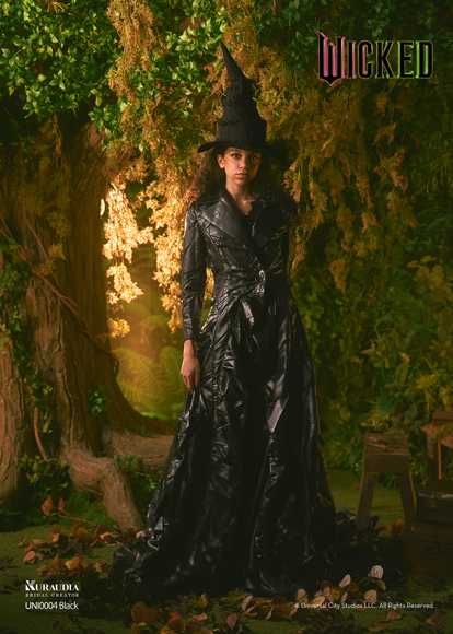 映画『ウィキッド永遠の約束』の象徴的な「エルファバ」の衣装から着想を得たブラックドレスです。レザー風サテンにワッシャー加工を施し、独特の艶と質感を持たせた素材と、同素材で仕立てたデザインジャケットが存在感を放ちます。ジャケットを脱ぐと、身頃にあしらったコードレースがやわらかな表情を添え、すっきりとしたマーメイドラインが大人の雰囲気を際立たせます。強さと優しさの両方をさりげなくまとうことができる、印象的なブラックドレスです。
