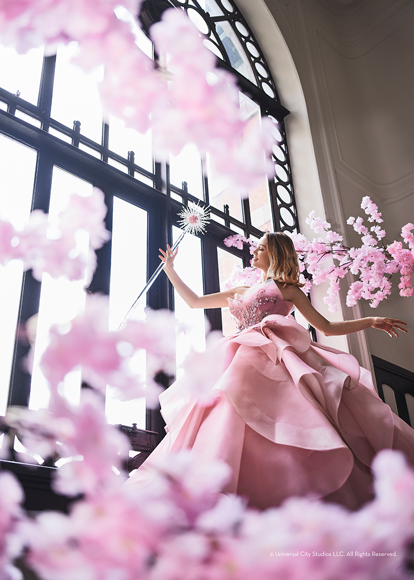 映画『ウィキッド ふたりの魔女』の象徴的な「グリンダ」の衣装からインスパイアされ、柔らかなチュールを贅沢に使用し、軽やかなフリルを随所にあしらった可愛いらしさあふれるピンクドレスです。肩から胸元にかけて広がる立体的なフリルが、表情豊かなボリュームを生み出し、動きに合わせてやわらかく揺れる、明るく可憐な印象に仕上げています。