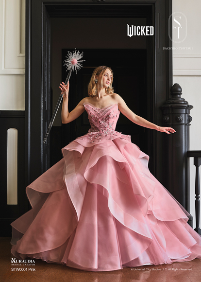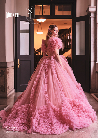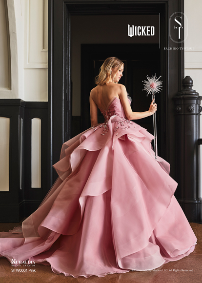 映画『ウィキッド ふたりの魔女』の象徴的な「グリンダ」の衣装からインスパイアされた華やかなドレスです。上品なピンクのサテンオーガンジー素材が、立体的に重なるフリルのデザインを美しく際立たせ、ふんわりとした広がりと透明感のある表情を生み出しています。