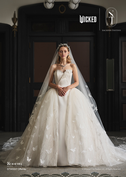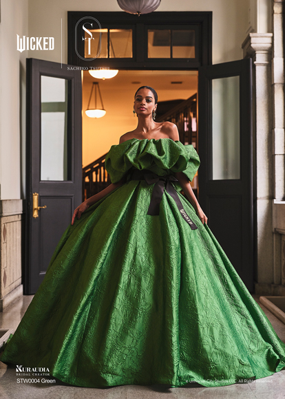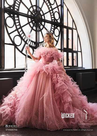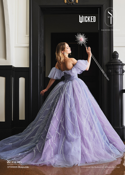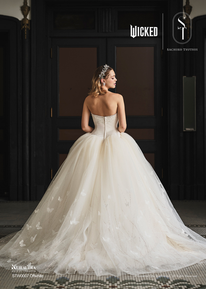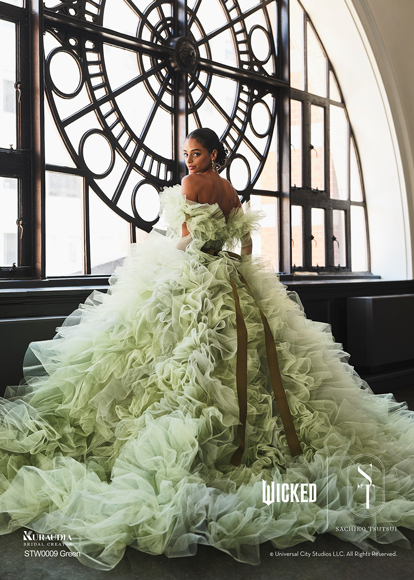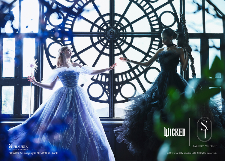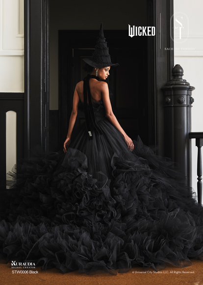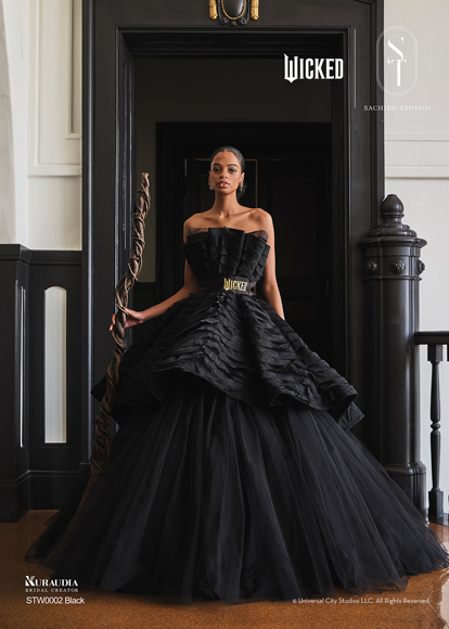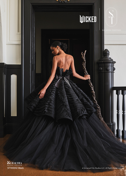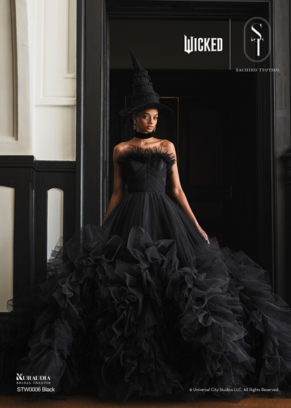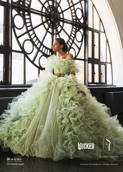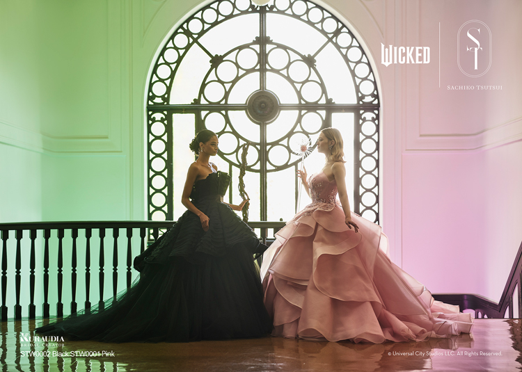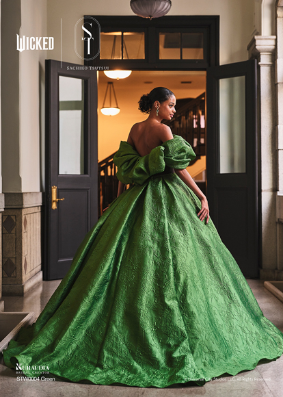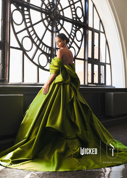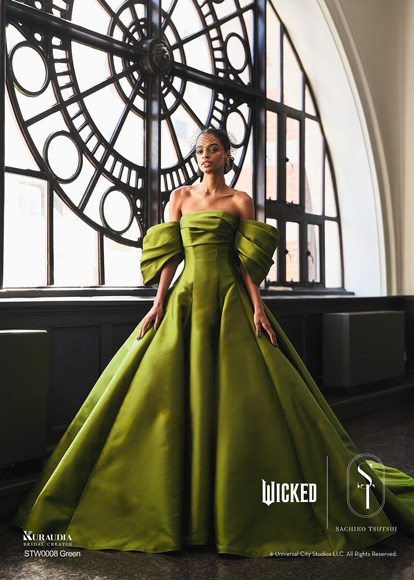 デザイナー・SACHIKO TSUTSUIの映画『ウィキッド』への深い敬意と、壮大な世界観から得たインスピレーションによって誕生したコラボレーション・コレクション。キャラクターへのオマージュに留まらず、作品が持つドラマティックな要素を昇華させた、大人の女性にふさわしい、上質で洗練されたウェディングスタイルがこのコレクションの最大の魅力。そして、ブランドのアイデンティティである「素材への徹底したこだわり」と「立体的な表現」を最大限に活かし、劇中で二人の魔女がまとう印象的な衣装から着想を得たドレスは、それぞれの個性が光るデザインに仕上がりました。「“自分らしさ”を大切にする花嫁にこそ届けたい。」――――そんなデザイナー自身の強い想いが込められたコレクションです。