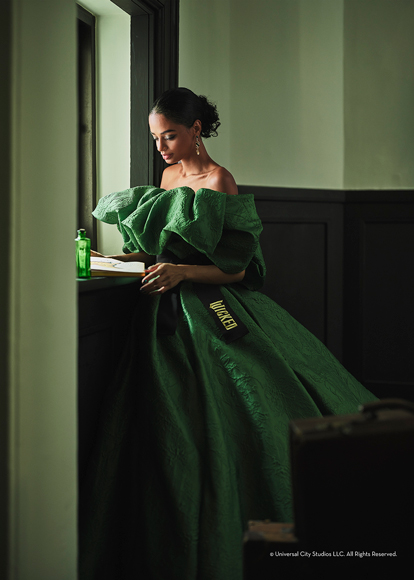 スカートはゆるやかに広がるボリュームシルエットで構成し、素材本来の質感が美しく際立つ仕上がりです。ウエストに配したブラックリボンには全体を引き締め、映画『ウィキッド 』のロゴをゴールの刺繍でさりげなくアクセントに。色合いと構築的なシルエットが調和された、「エルファバ」をイメージしたグリーンドレスです。