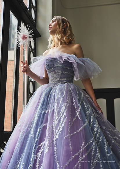映画『ウィキッド 永遠の約束』の象徴的な「グリンダ」の衣装からインスパイアされ、淡いラベンダーとミストブルーが溶け合うように広がる、幻想的なチュールドレス。スパンコールレースやグリンダチュールを重ね合わせ、流れる光のラインを描き、動くたびにきらめき輝きます。オフショルダーのエアリーなチュールは、肩まわりをふんわりと包み込み、透明感と華やかさを同時に演出。立体的に重ねた身頃のドレープが、胸元に柔らかな陰影をつくり、上品で洗練された印象に仕上げています。